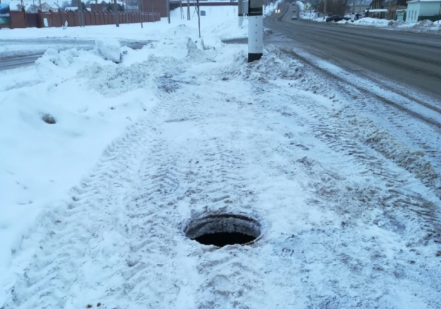 Судя по следам протектора, над колодцем недавно проехал трактор, чистящий снег. Пешеходов и автомобилистов просят быть предельно внимательными, а также особо тщательно необходимо следить за безопасностью детей.