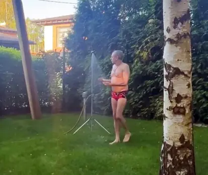 В кадре Михаил Корниенко включает холодную воду из «садового душа», ополаскивает грудь и руки, а затем подставляет под ледяные брызги плечи и спину.
