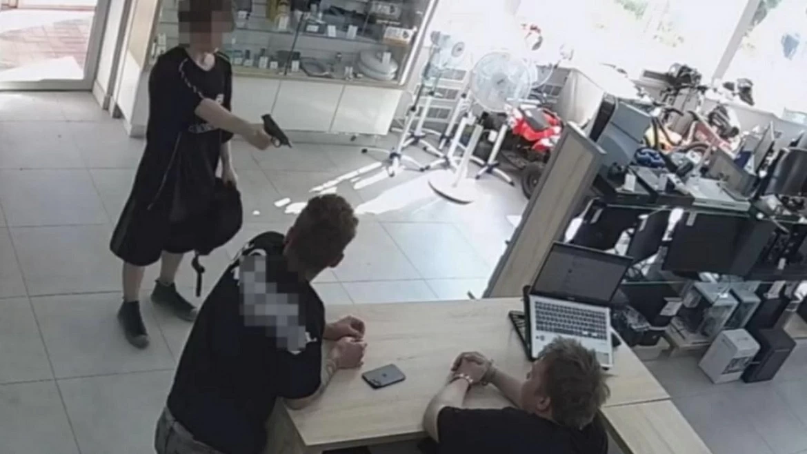В руках у молодого человека был незаряженный травматический пистолет. На видео с камер наблюдения видно, что молодой человек вошел в помещение комиссионки и наставил оружие на сотрудников магазина.