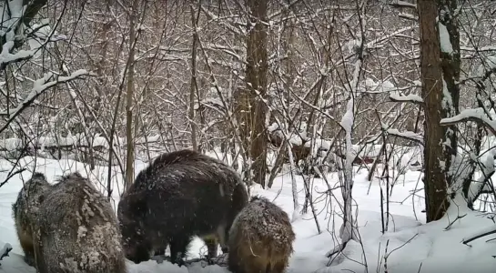 Сотрудники национального парка «Самарская Лука» зафиксировали на видео семейную группу кабанов, которые упорно искали скудный зимний корм под снегом. На записи видно, как один из молодых кабанчиков нашел что-то съедобное, но тут же был отогнан старшим сородичем с грозным рычанием.