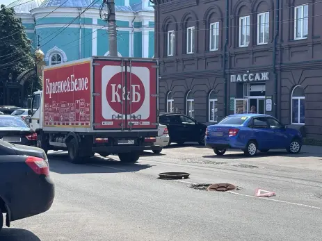 Грузовик с алкоголем едва не провалился под землю в Сызрани. Инцидент произошел возле Кафедрального собора в переулке Достоевского.