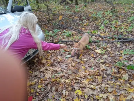 Женщина купила пакет куриных лап, сосисок и прочей еды, и отправилась с семьей на своем авто на старое место. Там сызранцы посигналили и лиса выбежала из леса.