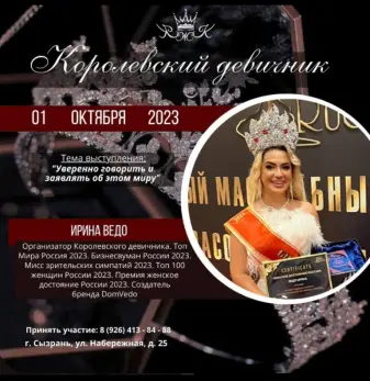 Жительниц Сызрани приглашают на Королевский девичник. Он пройдет 1 октября в фотостудии "Дом свадьбы". В роли его организатора выступает победительница всероссийского конкурса красоты «TOP BEST RUSSIA» Ирина Ведо.