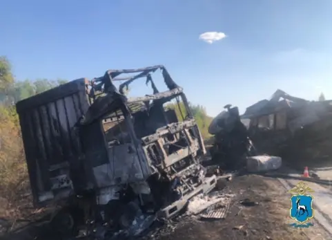 После столкновения вспыхнул пожар, огонь практически уничтожил один большегруз, другой лишь частично пострадал от огня. На дорогу высыпалась мука, которую перевозила одна из машин.