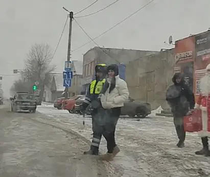 Днем 26 декабря на улице Рабочей патруль ДПС вместе с Дедом Морозом останавливали автомобили. Инспекторы проверяли водителей, а заодно водителям доставались неожиданные «бонусы» в виде куска пиццы.