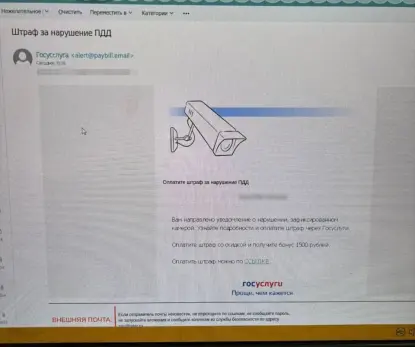 - Вам направлено уведомление о нарушении, зафиксированном камерой. Узнайте подробности и оплатите штраф через Госуслуги, - говорится в тексте письма.