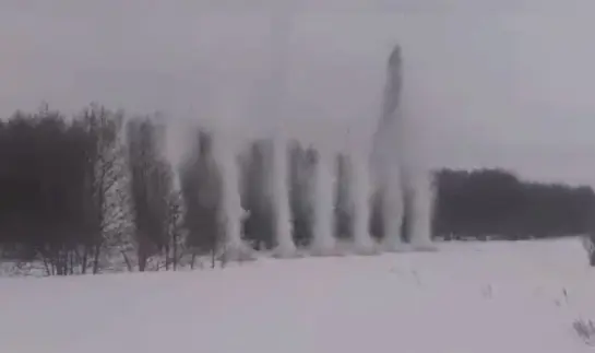 На кадрах ролика видно, как заложенные заряды в линию в момент подрываются и куски льда вместе с водой подлетают на несколько метров вверх.