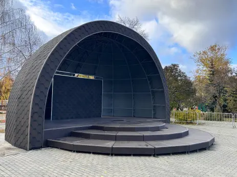 Конструкция в форме ракушки с арочным навесом, который защищает участников и зрителей от погодных условий, выполнена из прочного материала, а ее оснащение позволяет удобно разместить и артистов, и оборудование.