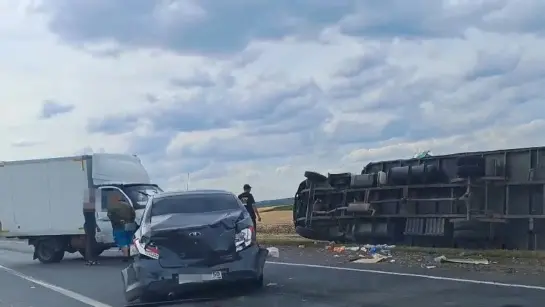 Сегодня днем, 30 июля, под Сызранью на трассе М-5 легла на бок грузовая фура. Вдоль дороги рассыпался груз.