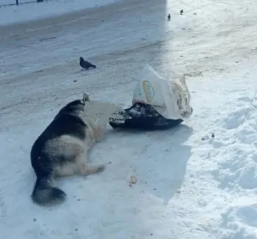 Она выдвинула версию о том, что живой собаке связали лапы и выбросили на помойку, а потом она замерзла на морозе. Автор поста выложила фото, на котором видно, что окоченевший черный пес под пакетом привлек внимание местной голодной бездомной собаки.