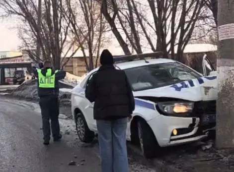 В Самарской области полицейский автомобиль врезался в столб. Кадры с места происшествия публикуют в сети.