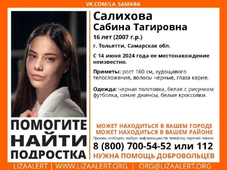 В Самарской области ищут 16-летнюю Сабину Салихову. Девушка пропала в 14 июня в городе Тольятти. Ориентировку с приметами пропавшей 19 июня распространил поисковый отряд «Лиза Алерт».