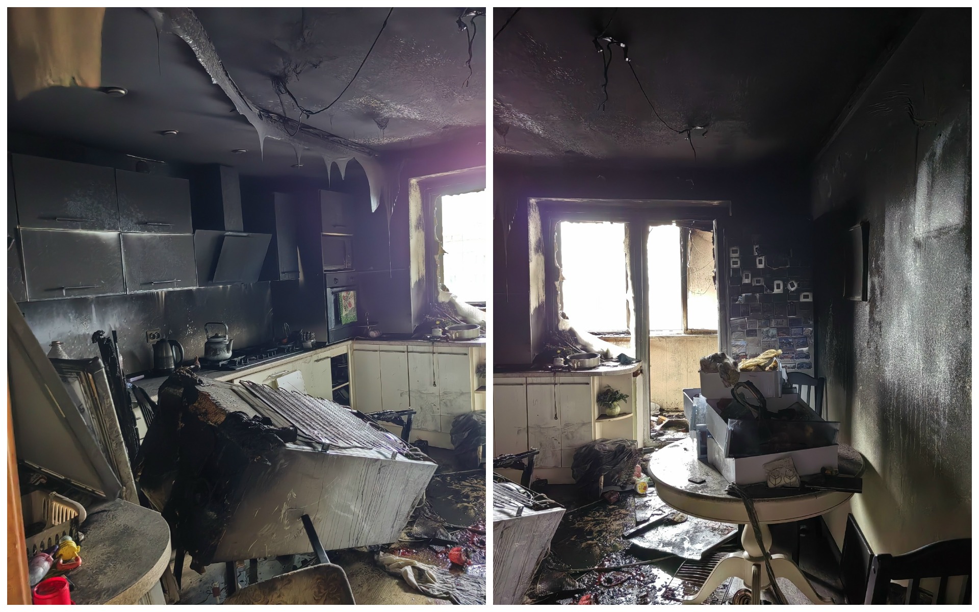 Как результат, пламя охватило кухню и балкон. А густой дым с копотью заполнили все помещение. Пожарным удалось быстро потушить огонь, но жить в квартире пока невозможно. Комнаты пропахли гарью, стены и потолки в саже, большая часть одежды, мебель также пострадали. Все это можно увидеть на кадрах из горевшей квартиры.