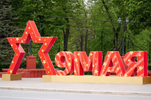 Например, в центре города у Кузнецкого парка появилась объемная надпись «9 мая» со звездой. Арт-объект со звездой и салютом на фоне голубого неба разместили в районе детского парка «Гномик».