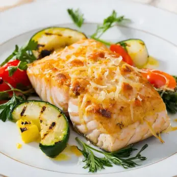 - Посыпьте натёртым пармезаном, чтобы сыр покрыл рыбу сверху.