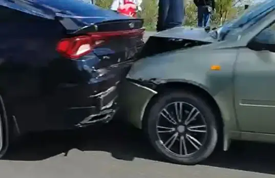 На кадрах видно, как из-под одного из автомобилей вытекает жидкость, возможно это горюче-смазочные материалы. У иномарки поврежден задний бампер и частично кузов. У вазовского авто, соответственно, разбита передняя часть.