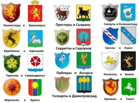 - Для любителей великих фэнтези саг: гербы Домов Вестероса vs гербы российских городов. Теперь вы знаете куда можно съездить, а где опасно..., - пояснили авторы «Вершины злодейства».