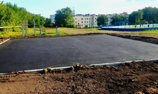 На данный момент уже готово щебёночное основание и уложен асфальт, ожидается поставка спортивного оборудования.