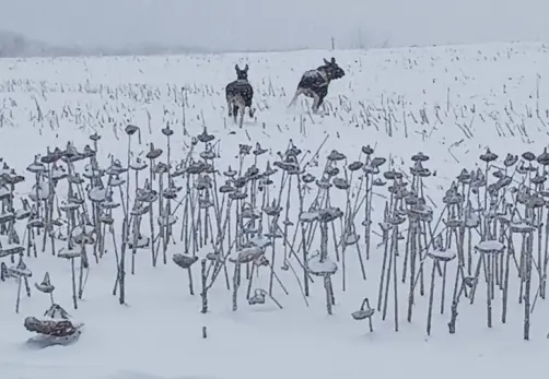 На фото видно, что подсолнечник, который остался на поле после уборочной компании, привлек внимание диких животных. Лоси поедали семена и чувствовали себя комфортно.
