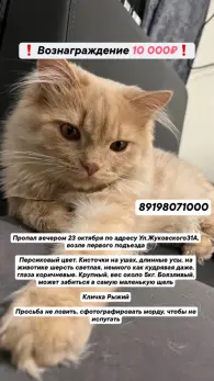 Известно, что кот по кличке Рыжий пропал вечером, 23 октября на улице Жуковского,31 А возле первого подъезда. Характерные приметы питомца: шерсть персикового цвета, кисточки на ушах, длинные усы, на животе шерсть светлая (местами кудрявая), глаза коричневые. Вес крупный - около пяти килограммов. По характеру кот боязливый, может забиться даже в самую маленькую щель.