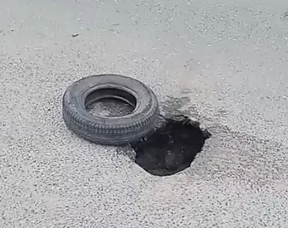 Провал в асфальте на проезжей части односторонней дороги красуется уже не первый день. Кто-то из местных жителей прикрыл дыру шиной. Сделано это было, видимо, с благой целью.
