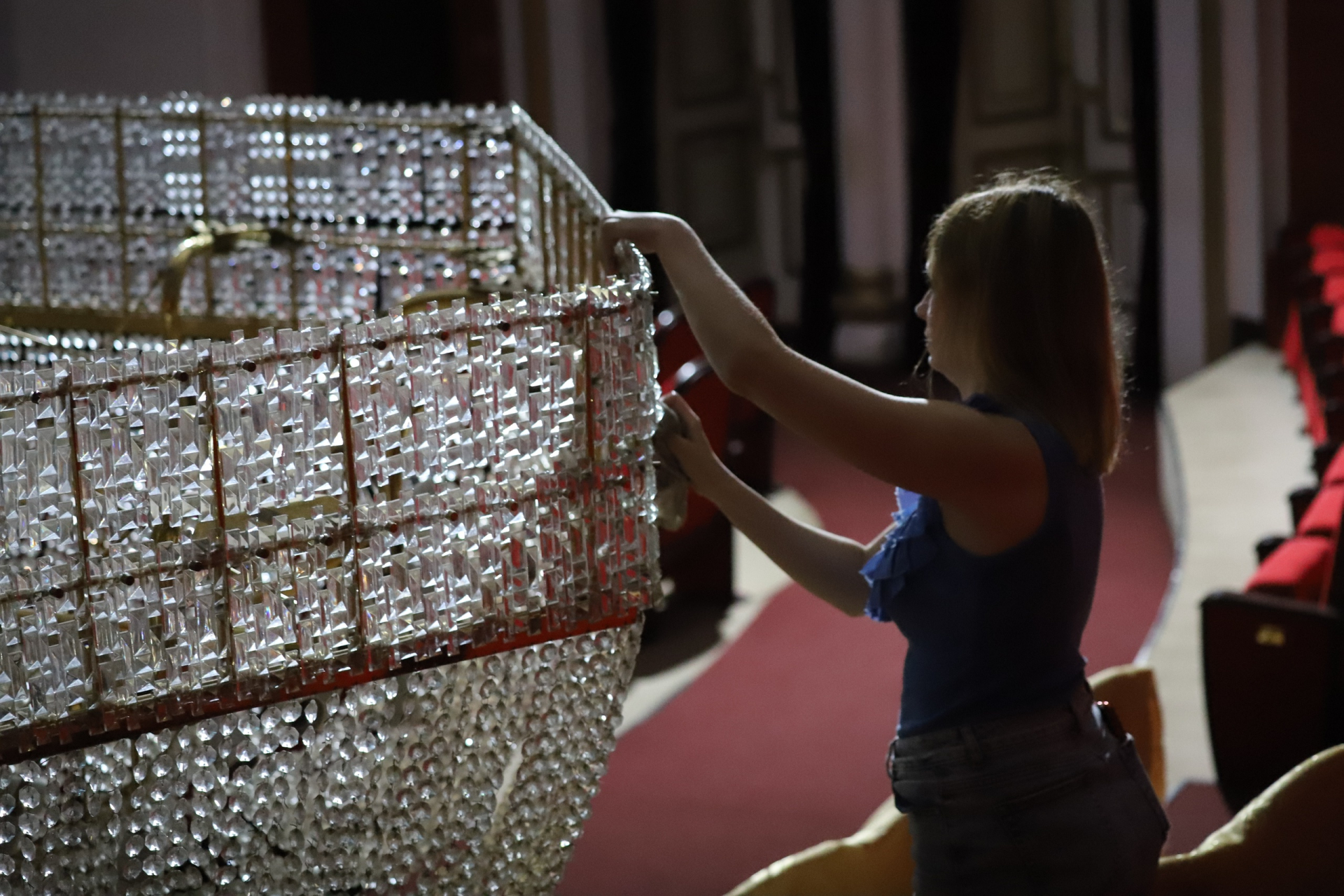 В театре это называют особым событием. Чтобы помыть люстру диаметром пять метров, высотой два метра и весом 500 килограммов, ее спускают с 12-метровой высоты в партер.
