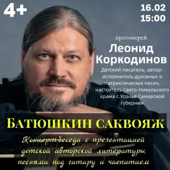В Сызрань настоятель Свято-Никольского храма села Усолье приедет в воскресенье, 16 февраля, с программой «Батюшкин саквояж» (4+). Встреча пройдет в формате «концерта-беседы», в ходе которой пройдет презентация детской авторской литературы Леонида Коркодинова. Также гостей ждут песни под гитару от батюшки и чаепитие.