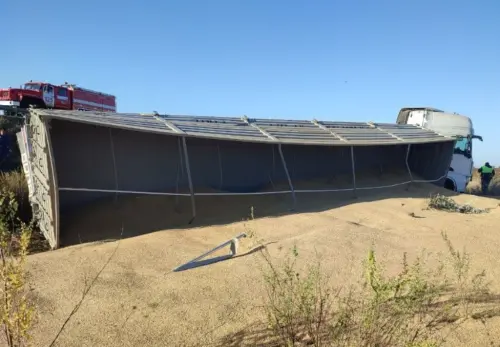 Около восьми часов утра фура, груженая зерном, съехала в кювет, в результате чего прицеп опрокинулся и зерно высыпалось. Об этом сообщили в Центре по делам ГО, ПБ и ЧС.