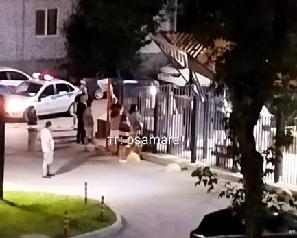 К сообщению приложено фото, на котором видно, как в темное время суток во дворе многоэтажного дома у забора и шлагбаума наблюдается некоторое скопление людей, а также стоит машина полиции с мигалками.