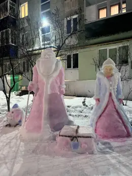 После сильного снегопада наступила оттепель, которая сделала снег идеальным материалом для снежных скульптур. В преддверии Нового года люди решили подарить себе и соседям праздничное настроение. На площадке перед домом появились дед Мороз и Снегурочка, царевна-лягушка, белочка с орешками из «золота». Рядом расположились лебеди, медведь и кот.
