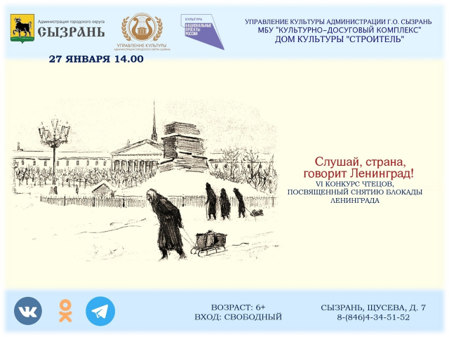27 января является Днем воинской славы России. В этот день будет отмечаться 79-я годовщина полного освобождения советскими войсками города Ленинграда от блокады его немецко-фашистскими войсками. В честь этой памятной даты в Сызрани состоится городской конкурс чтецов под названием «Слушай страна, говорит Ленинград!».