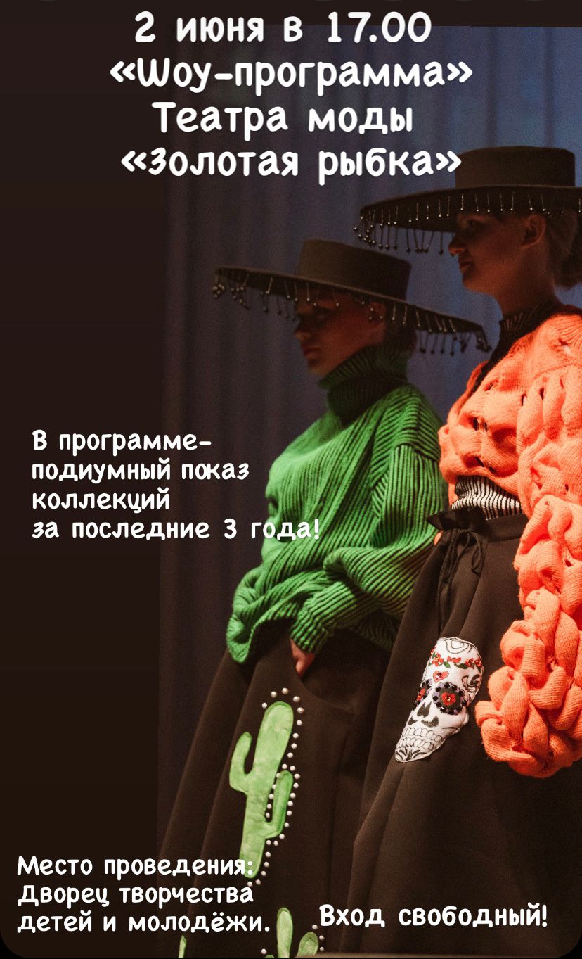 Во Дворце творчества детей и молодежи пройдет шоу-программа театра моды «Золотая рыбка». В программе ожидается демонстрация женских и мужских предметов гардероба разных стилей и направленностей.