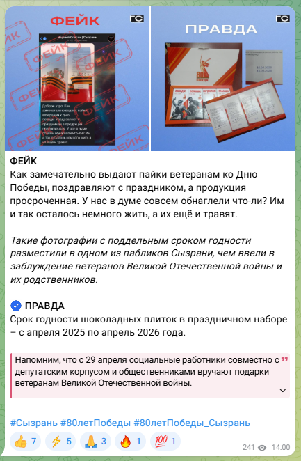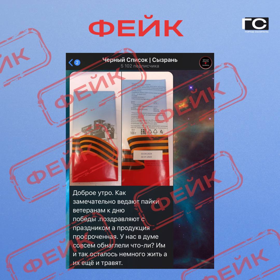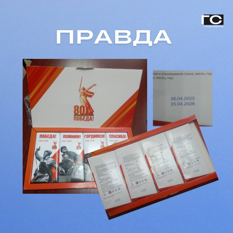 Администрация Сызрани назвала фейком появившееся в местном паблике сообщение о якобы просроченных сладостях в подарках для ветеранов к 80-летию Победы. В частности, в сети сообщалось, что в подарочных наборах якобы оказались шоколадные плитки со сроком годности до прошедшего января.