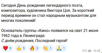 - С днем рождения, Последний герой! - сообщила администрация города на своем ресурсе в сети, напомнив, что со дня рождения музыканта прошло 62 года, и опубликовав строчки из песни «Звезда по имени Солнце».