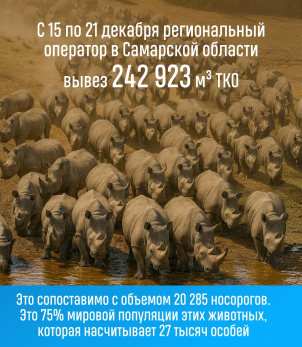 В Самарской области чиновники взглянули на твердые коммунальные отходы под необычным углом и перевели кубометры мусора в поголовье носорогов. Соответствующую инфографику опубликовали власти областной столицы. Результат получился впечатляющим - за неделю из региона вывезли целых 20 285 носорогов мусора.