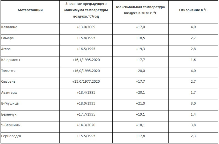 Значительные превышения также зафиксированы в Тольятти и Клявлино - сразу на 4 градуса выше прежних значений. В Самаре воздух прогрелся до +18,5, обновив рекорд 1995 года на 2,7 градуса. Новые температурные максимумы установлены также в Аглосе +19,3 градусов, Авангарде +20,1, Большой Глушице +21,0, Безенчуке +19,1, Серноводске +17,8 и Кинель-Черкассах +17,7.