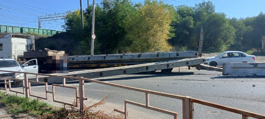 На повороте перед железнодорожным мостом, балки свалились с платформы на дорогу. Очевидцы утверждают, что тяжелый груз задел проезжающий мимо автомобиль Lada Vesta.