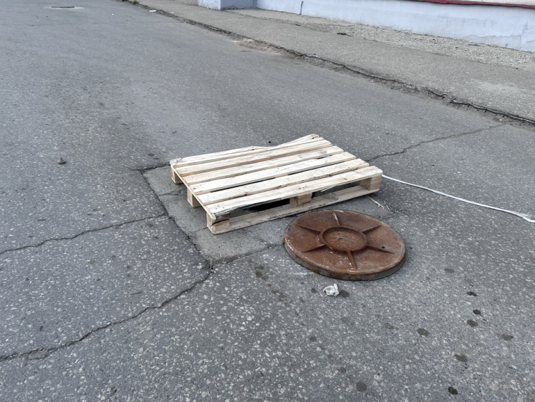 Отметим, что рядом с этим же зданием у парковки почти два месяца назад был открыт колодец. Опасную засаду прикрыли деревянными поддонами, хотя крышка лежала рядом.