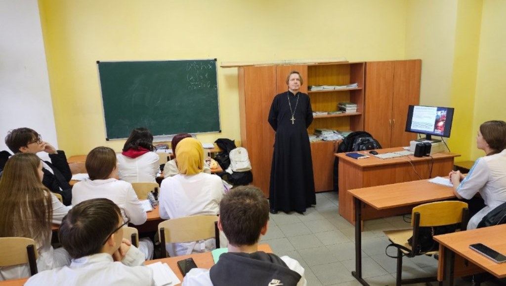Настоятель храма святого великомученика Георгия Победоносца протоиерей Александр Устинов встретился с первокурсниками медико-гуманитарного колледжа. Девушки и юноши обучаются по специальности «Акушерское дело».
