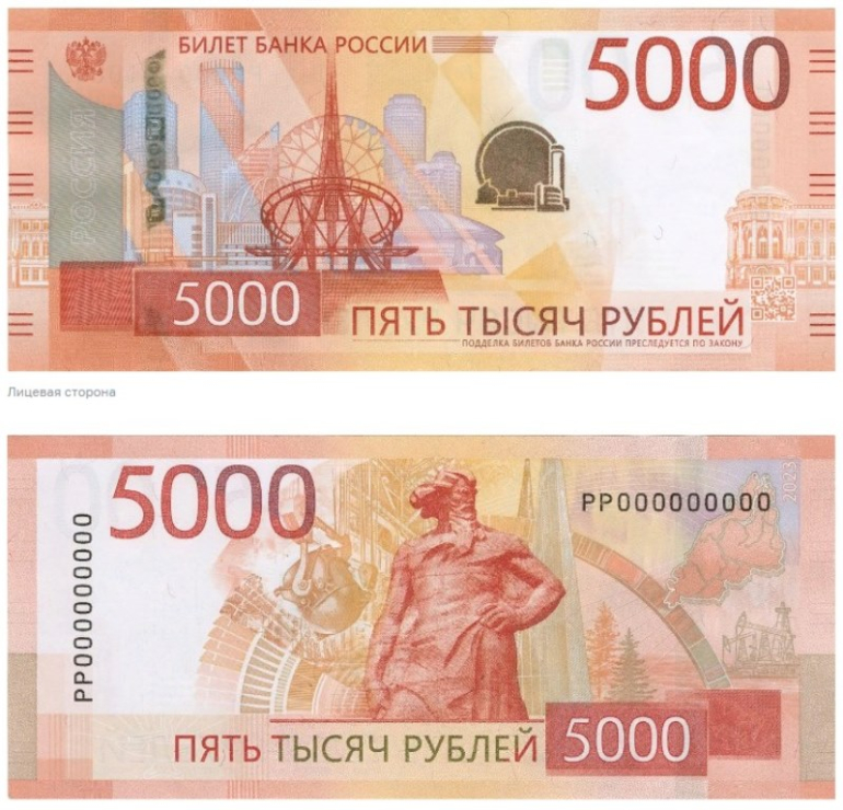Пятитысячная банкнота посвящена Екатеринбургу и Уральскому федеральному округу. Основное изображение лицевой стороны - стела «Европа-Азия», на оборотной стороне представлены памятник «Сказ об Урале» в Челябинске, стела «66-параллель» (Полярный круг) в Салехарде.