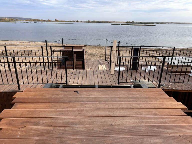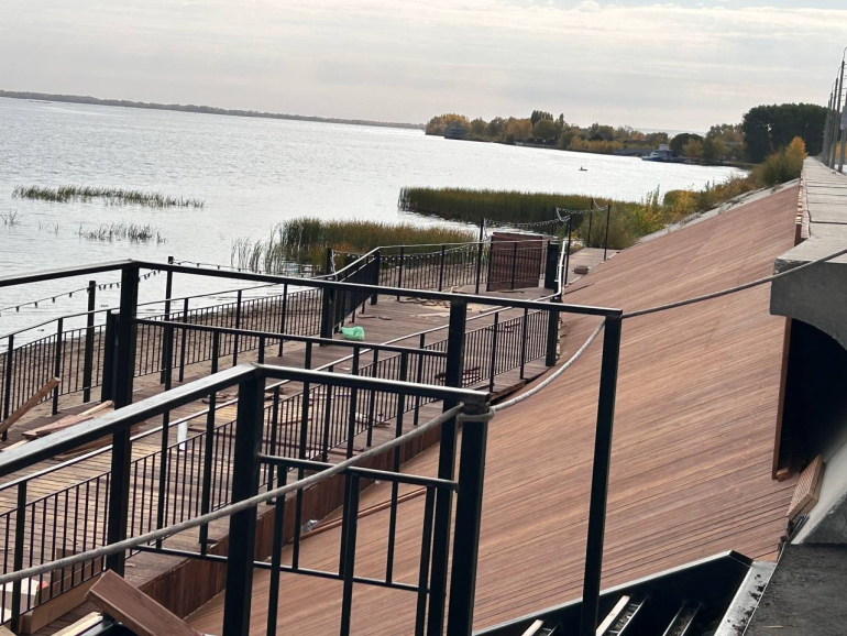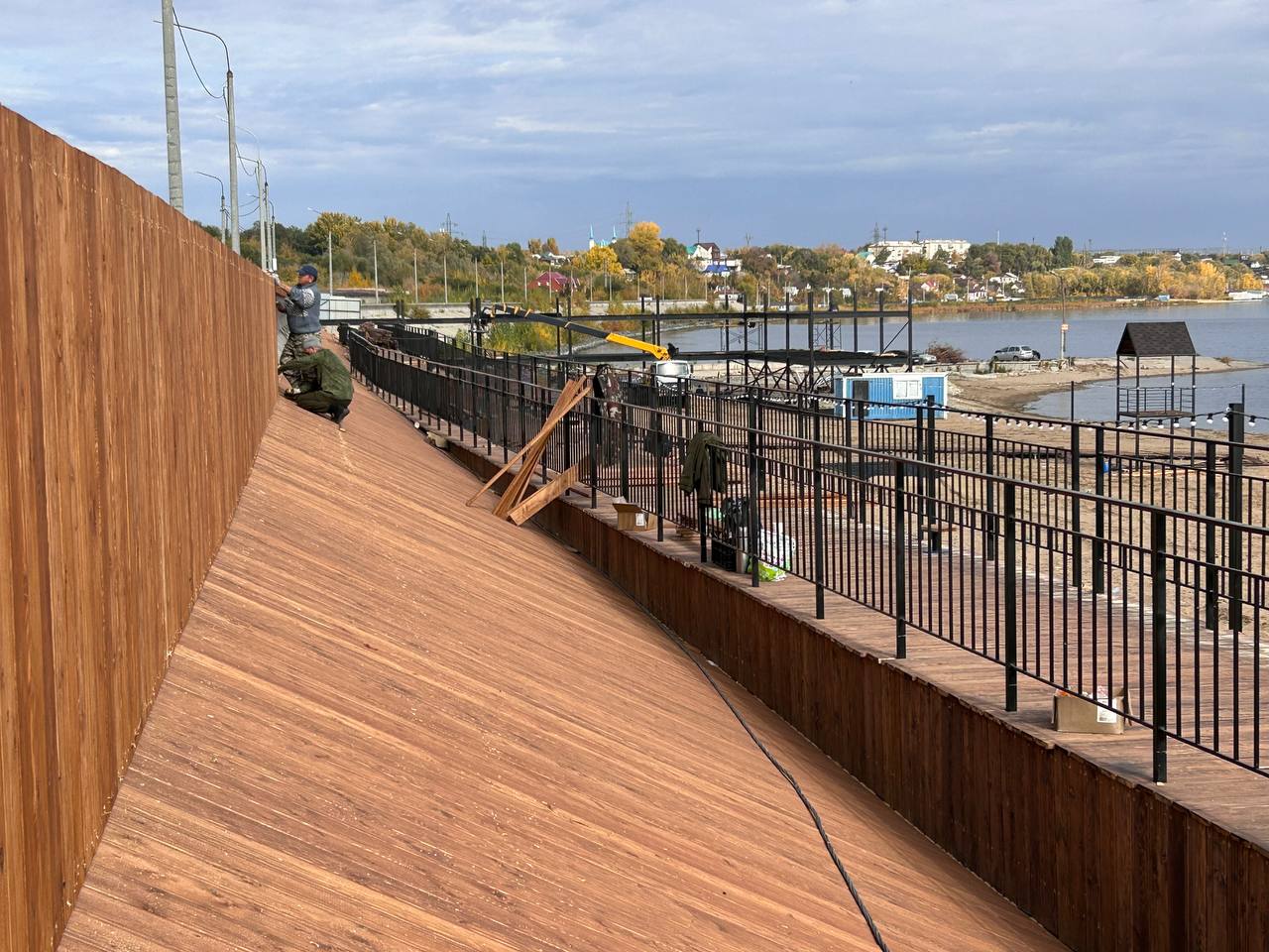 Лестничные спуски, тыльная сторона дамбы, амфитеатр в виде трибун и дорожки до воды – все это сейчас рабочие обшивают доской. Объем работ здесь большой и пока не завершен.