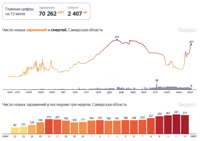 Также за сутки в Самарской области скончались 9 пациентов с Covid-19. С начала пандемии в области зарегистрировано 2 407 летальных исходов, а беспрерывная череда смертей продолжается 112 дней подряд.