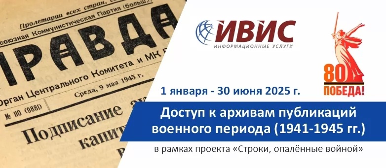 До 30 июня 2025 года открыт доступ к архивам:– Электронный архив журнала «Огонёк» за 1941–1945 гг.– Архивы газет «Известия», «Литературная газета», «Правда» за 1941–1945 гг.– Уникальная коллекция «Партизанская печать Беларуси» – газеты, издававшиеся в 1942–1944 гг. на оккупированной территории.