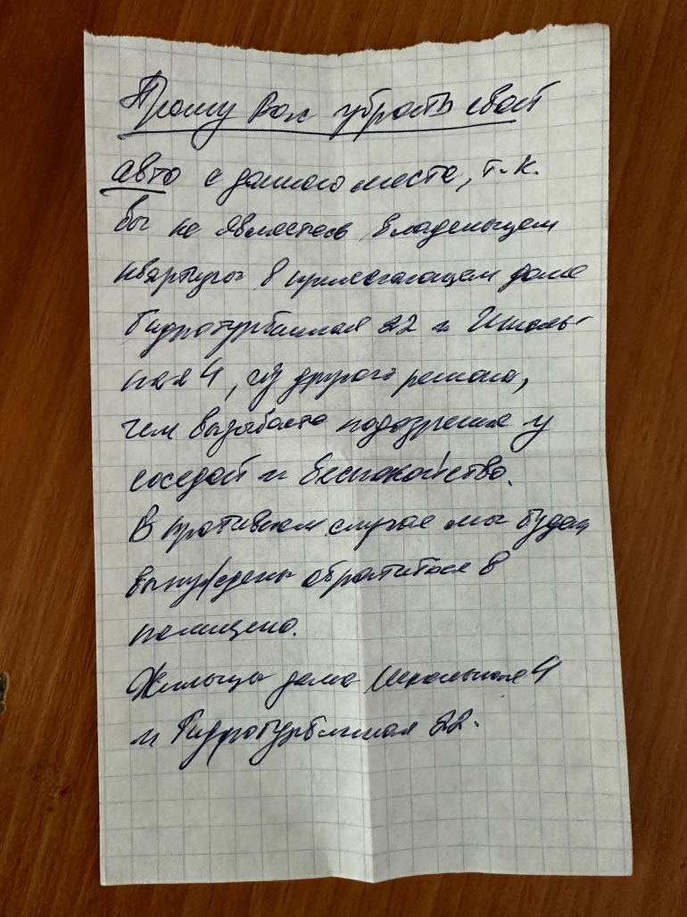«Прошу вас убрать свой авто с нашего места, т.к вы не являетесь владельцем квартиры в прилегающем доме Гидротурбинная 22 и Школьная 4, из другого региона, чем вызвано подозрение у соседей и беспокойство. В противном случае мы будем вынуждены обратиться в полицию», - говорится в записке за подписью «Жильцы дома Школьная 4 и Гидротурбинная 22.