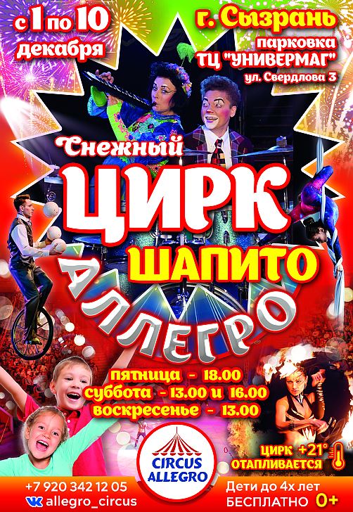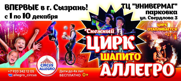 В Сызрань в первые дни зимы приедет с гастролями цирк-шапито «Аллегро» (0+). Цирковые артисты приготовили для горожан и гостей Сызрани грандиозное шоу для всей семьи.