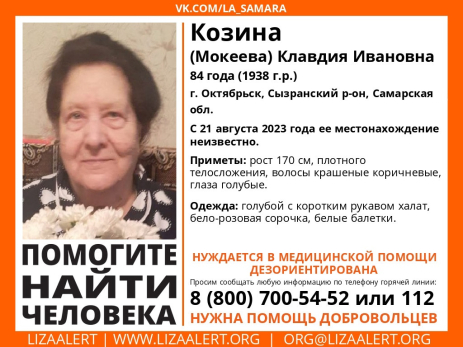 В Самарской области продолжаются поиски 84-летней Клавдии Ивановны Козиной. Напомним, пожилая женщина бесследно исчезла в городе Октябрьске еще 21 августа. Поисковый отряд «ЛизаАлерт» сообщил 28 сентября о повторном выезде на поиски пенсионерки.