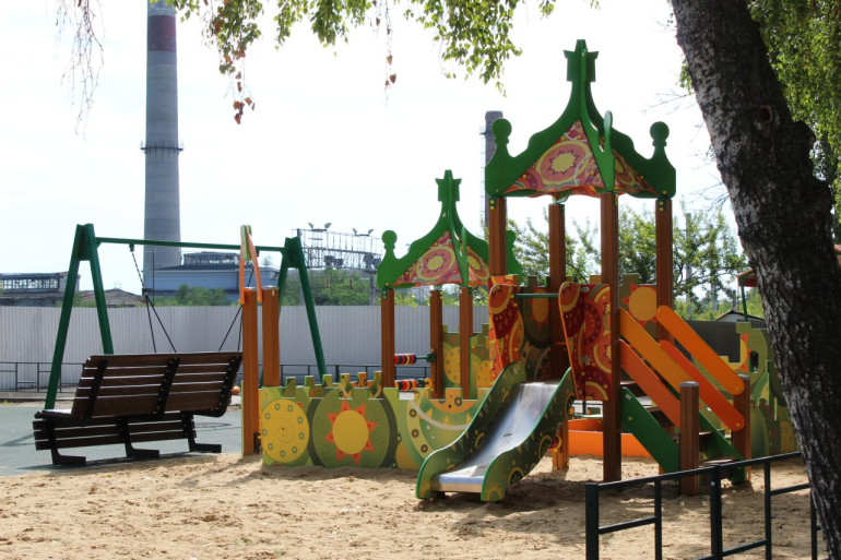 Яркая современная спортивно-игровая площадка для детей значительно оживляет двор. На ней уже установлен спортивный комплекс, оборудован песочный дворик, установлены качели и два столика с навесом для настольных игр.