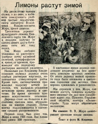 - На дворе стоит зимняя стужа, а на окне, в кабинете заведующего учебной частью педагогического института Владимира Владиславовича Жеро, зреют лимоны. Трехлетнее деревцо культурного лимона Павловского сорта тов. Жеро в подарок получил от одного своего друга-ботаника пять лет тому назад. Тов. Жеро любовно ухаживал за растением: удобрял почву калийной селитрой, суперфосфатом и, время от времени, производил его подкормку раствором железной ржавчины. Несколько раз Владимир Владиславович поливал деревцо очень слабым раствором марганца, являющегося стимулятором роста. Кроме того, систематически производил подрезку ветвей растения, что вызывало усиленное ветвление кроны деревца и цветение. Во время цветения применял искусственное опыление. Деревцо стоит на большом и достаточно светлом окне, обращенном на южную сторону. Почва всегда поддерживается в состоянии средней увлажненности, - рассказывает автор заметки Н. Киденко.