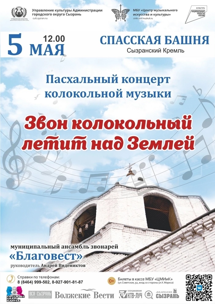 5 мая в 12:00 на Спасской башне Сызранского кремля состоится традиционный Пасхальный концерт колокольной музыки «Звон колокольный летит над землей» (0+).