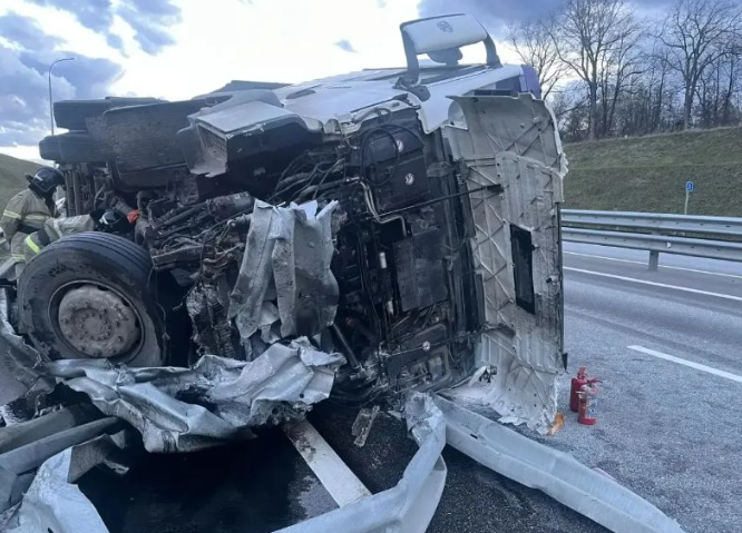 ЧП произошло на 31-м километре трассы. Кабина грузовой фуры была разбита всмятку.
